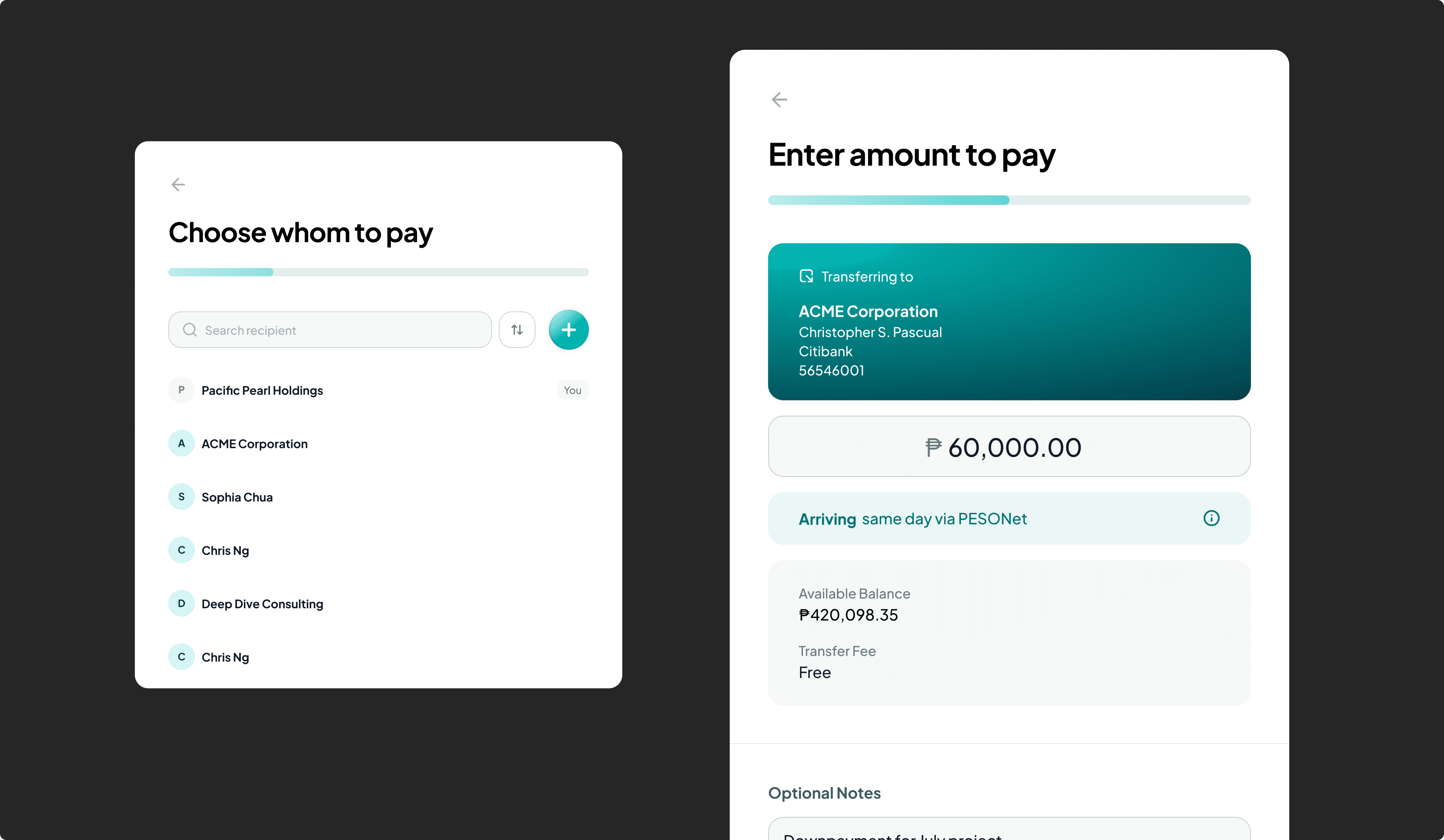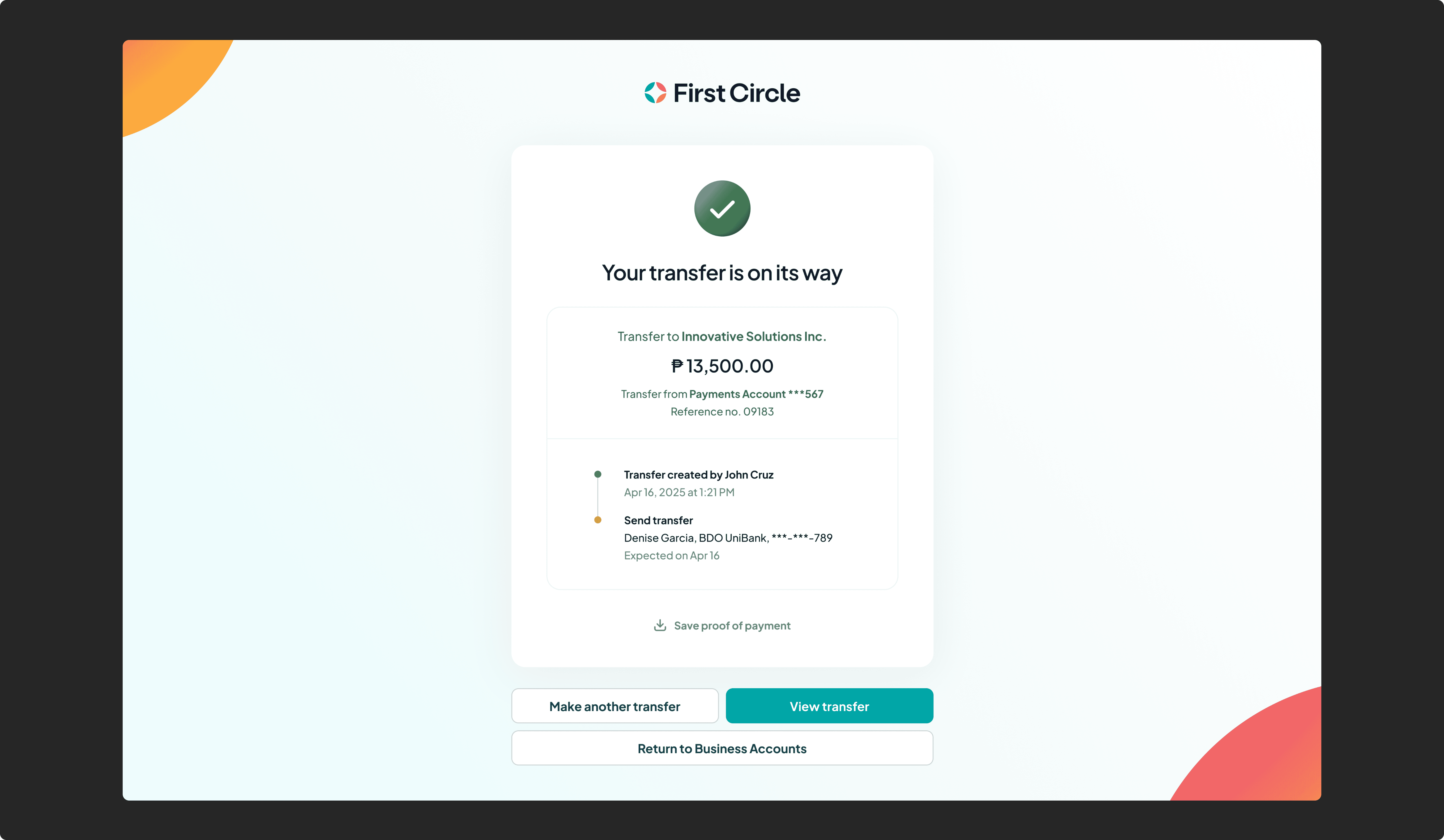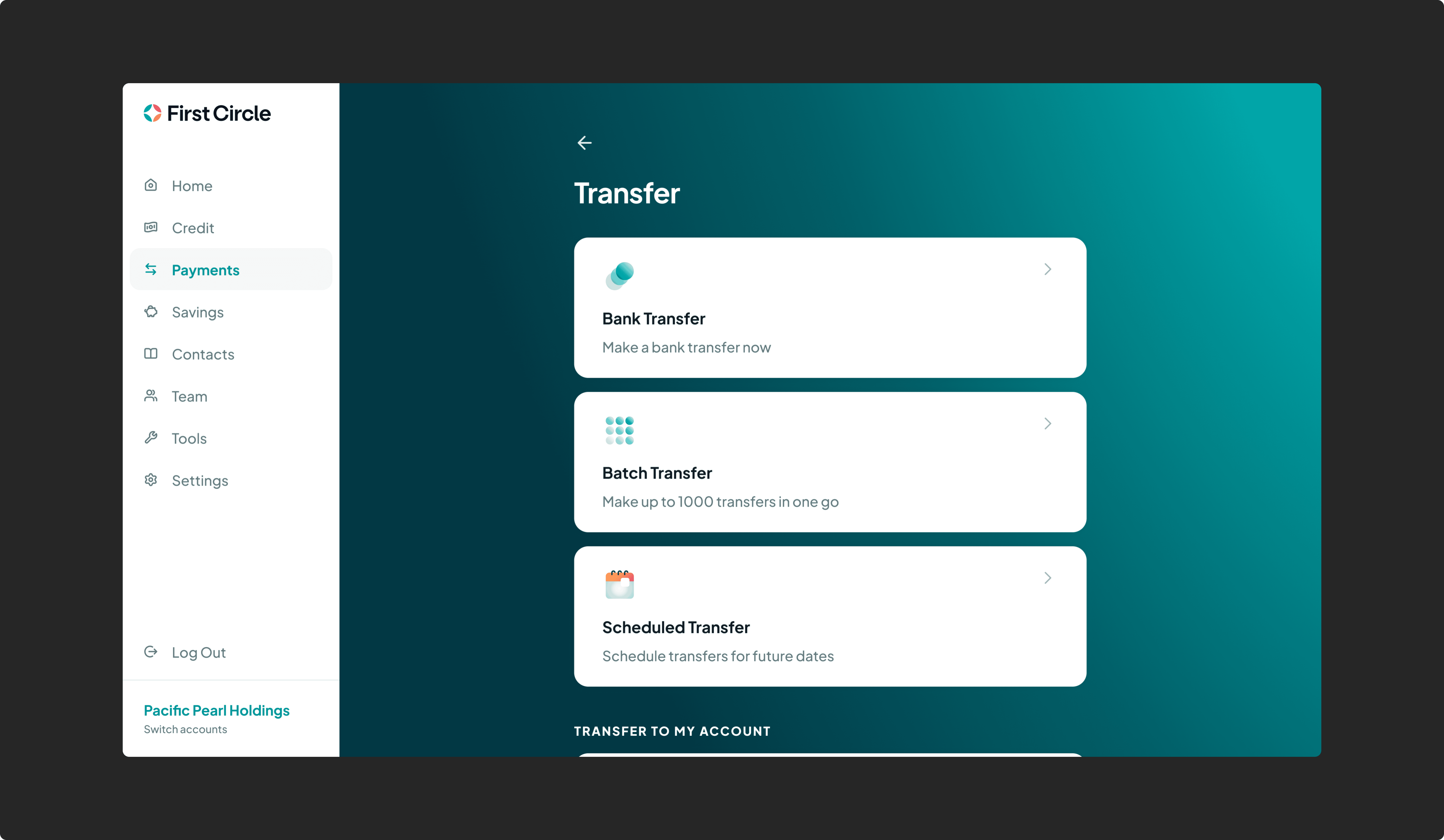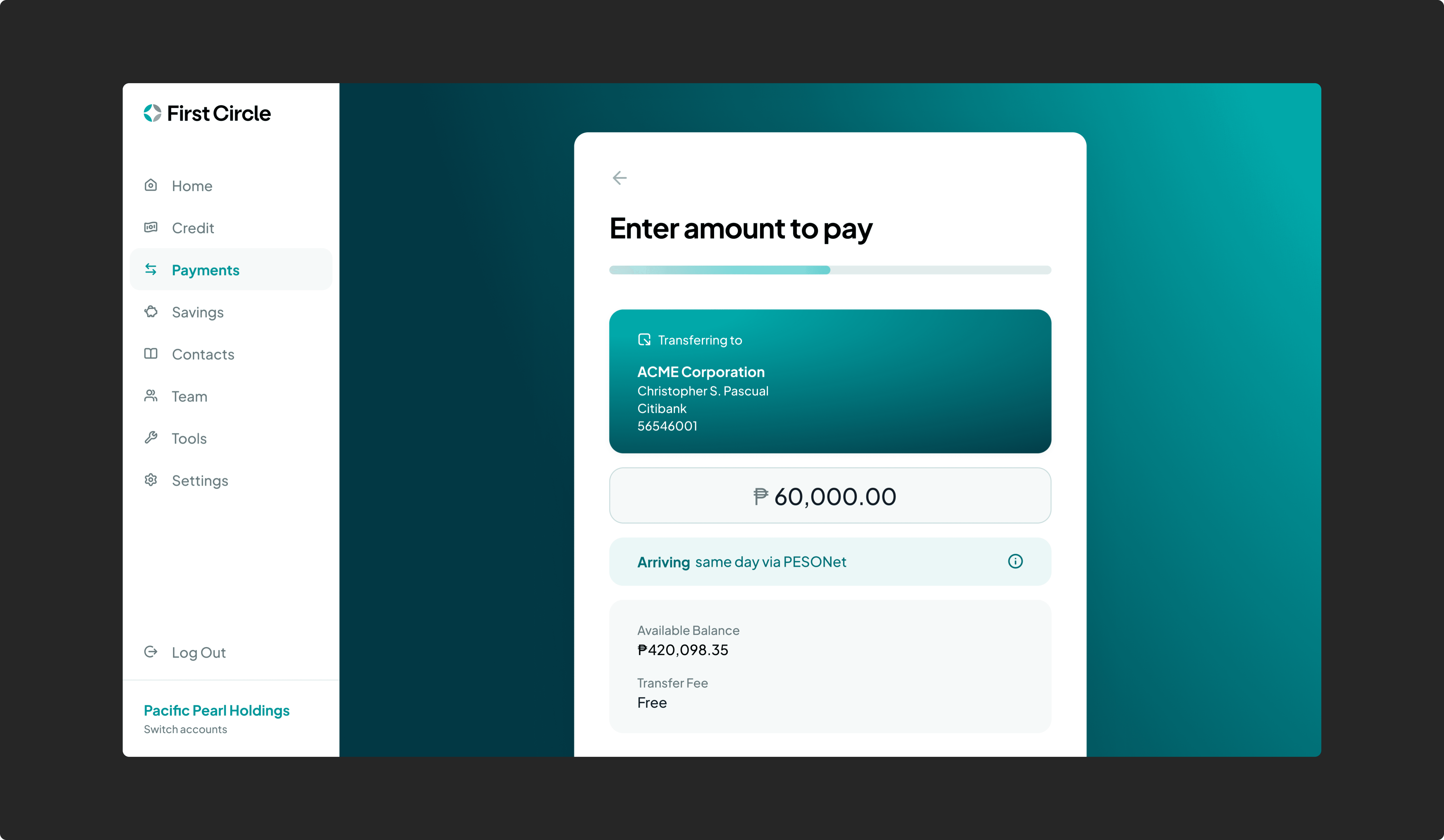 In 2024, First Circle launched Business Banking for SMEs, with payments as a core day-to-day capability. Our platform supported multiple transfer methods, each designed as a separate flow to meet different operational needs.